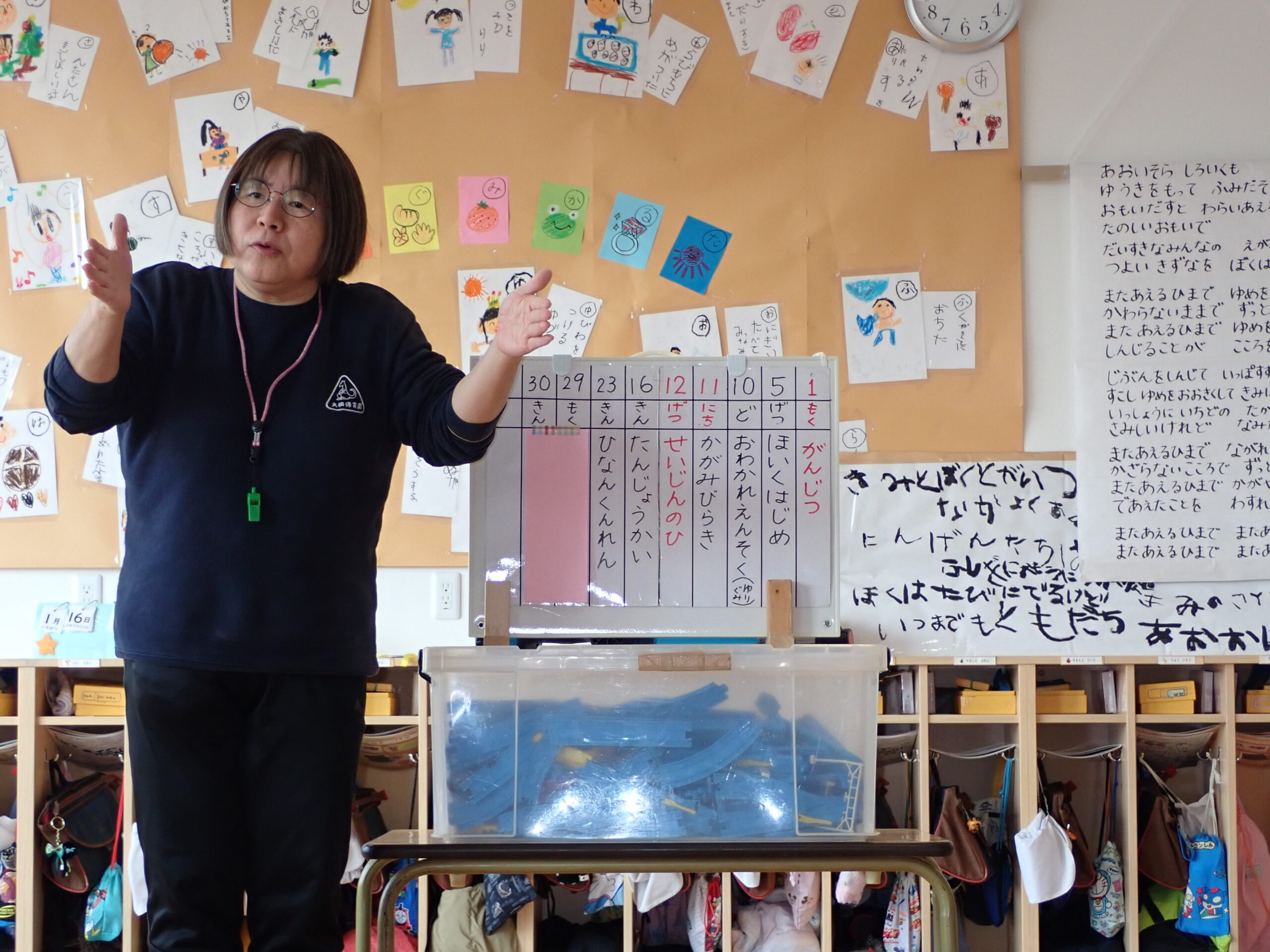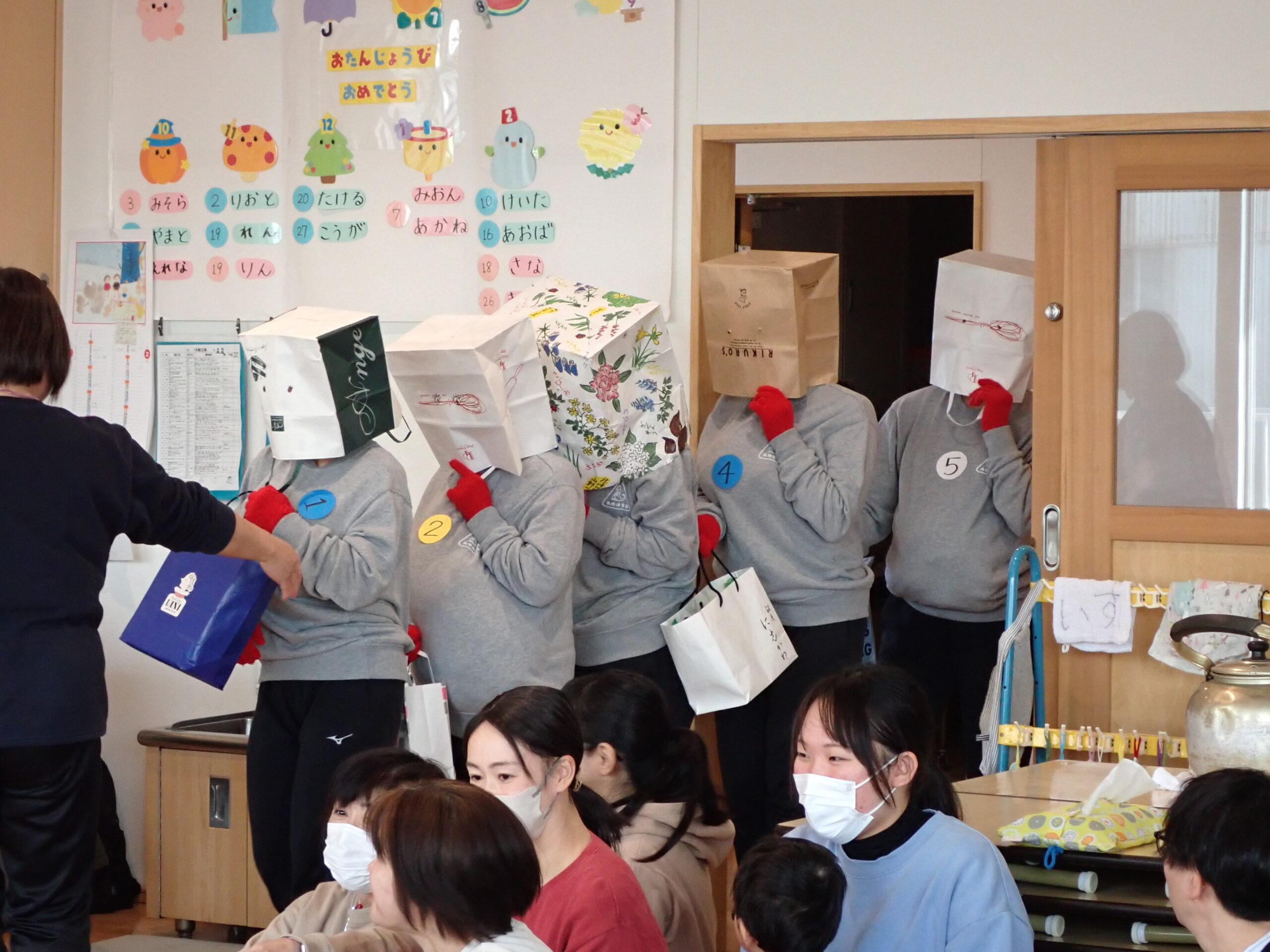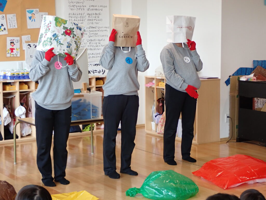1月の誕生会🎉 2026年1月16日 最終更新日時 : 2026年1月16日 oogiri-hoiku 1月の誕生会がありました💐 行事クイズでは積極的に手を挙げて答えてくれていました🙌 今月の出し物は「誰でしょうクイズ」でした。 「うわー なんやー!」「だれやろー?」と登場時から盛り上がっていました。 カラーポリで作った好きな食べ物をヒントに一人ひとりが頭をフル回転させ「ぜったい〇〇先生や!」「でも前に座ってんで」など推理しました。 しかし変装が凝っていて全然当たらず苦戦していました…。それでも一人が当たるとポンポンっと連続正解し最後には「やったーっ!!」っと笑顔あふれる誕生会になりました。